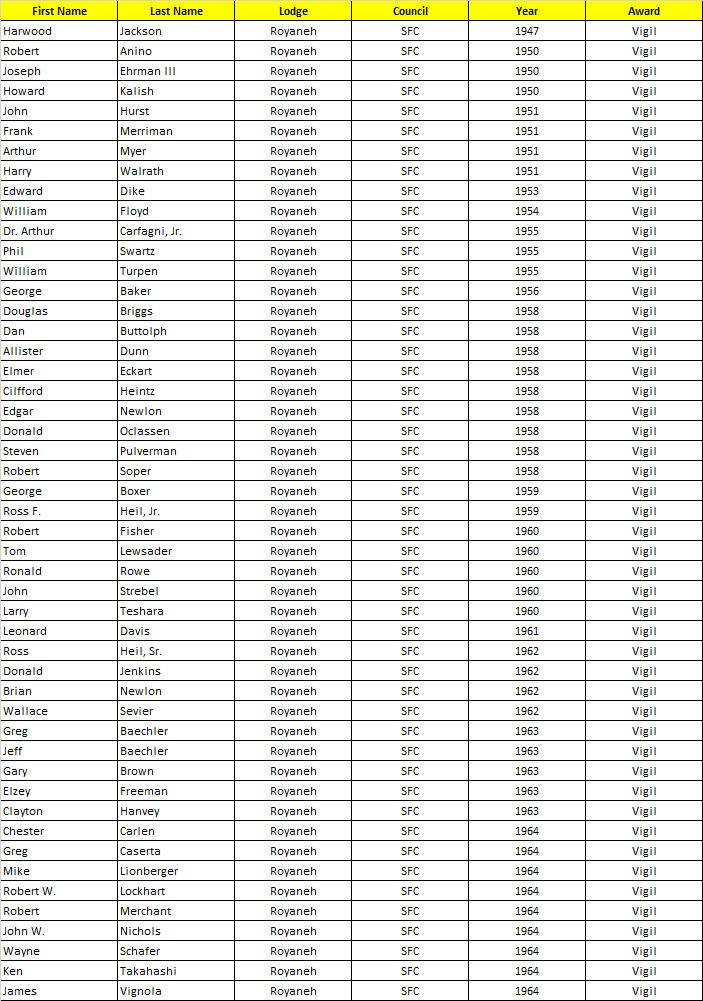 Royaneh Lodge - Vigil Members (1944 - 1964):